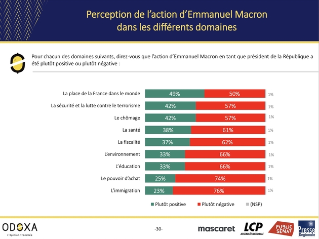 Si Emmanuel Macron fait dans cette enquête figure de favori par défaut, il reste toutefois jugé négativement sur son bilan. Dans chacun des grands domaines d’action passés au crible du baromètre Odoxa, les jugements négatifs l’emportent toujours sur la part des personnes satisfaites. Plus de 6 Français sur 10 jugent que son action a été négative sur la santé (61 %), sur la fiscalité (62 %), sur l’environnement (66 %) ou encore l’éducation (66 %). La défiance est encore plus importante s’agissant de l’immigration (76 % des personnes insatisfaites) et du pouvoir d’achat (74 %), thème central dans cette campagne présidentielle.